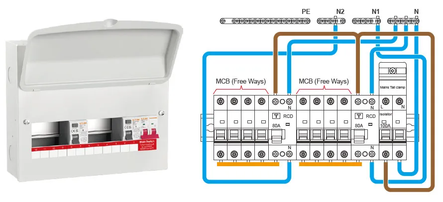 This unit utilizes MCBs throughout divided between two RCCBs. Circuit independence or separate electrical protection cannot be achieved here.