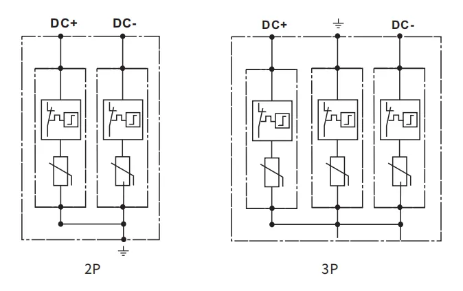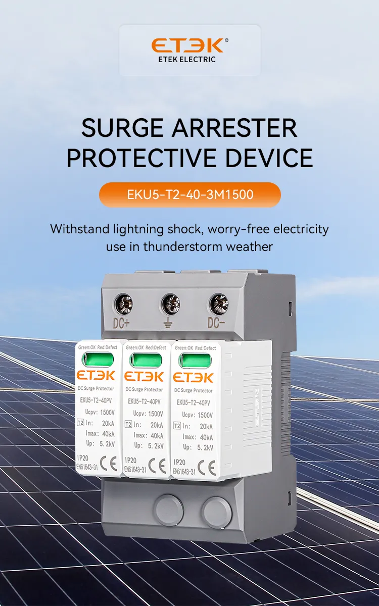 EKU5-T2-40 PV SPD is a DC surge protector specially designed for photovoltaic power supply systems. Max continuous operating voltage reach DC1500V.These units must be installed in parallel on the DC networks to be protected and provide common and different modes protection. Its installed location is recommended at both ends of the DC power supply line (solar panel side and inverter/converter side), especially if the line routing is external and long.