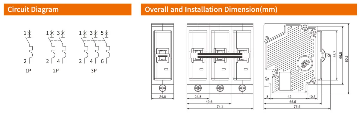 | Number of poles | 1P, 2P, 3P |
