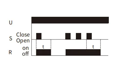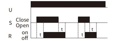 When time delay t is complete, relay contacts R change state for time delay t.